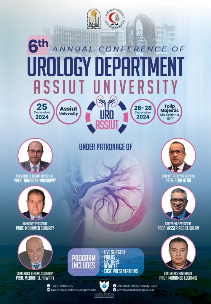 ينظم قسم جراحة المسالك البولية والتناسلية بجامعة أسيوط مؤتمره السنوي السادس حول الجديد في جراحات المسالك البولية، تحت رعاية الأستاذ الدكتور أحمد المنشاوي رئيس الجامعة، والأستاذ الدكتور علاء عطية عميد كلية الطب ورئيس مجلس إدارة المستشفيات الجامعية، والأستاذ الدكتور محمد أحمد شلبي رئيس شرف المؤتمر،