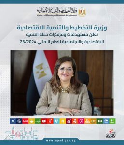 أعلنت د.هالة السعيد وزيرة التخطيط والتنمية الاقتصادية مستهدفات ومرتكزات خطة التنمية الاقتصادية والاجتماعية للعام الـمالي (23/2024) والعامُ الثاني من الخِطة مُتوسّطة الـمدى للتنميةِ الـمُستدامةِ (22/2023 – 25/2026).