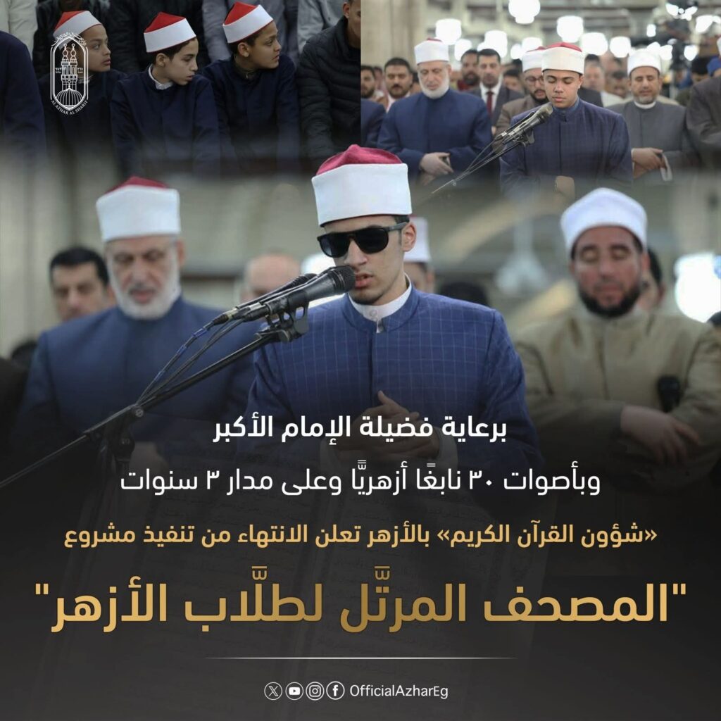 أعلنت الإدارة العامة لشئون القرآن الكريم الانتهاء من مشروع ” المصحف المرتل لطلاب الأزهر الشريف ” حيث تم تسجيل المصحف المرتل بأصوات ٣٠ طالبًا أزهريا متميزًا لم يتجاوزوا الثامنة عشرة، وقع عليهم الاختيار من بين أكثر من ١٨٠ ألف طالب