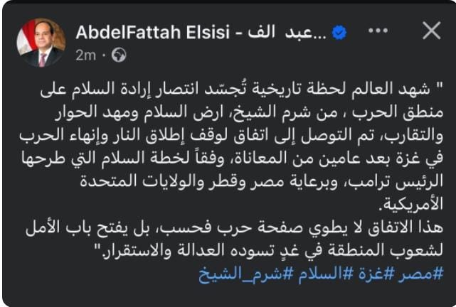 تم التوصل إلي اتفاق لوقف إطلاق النار وإنهاء الحرب فى غزه بعد عامين من المعاناه وفق لحظه السلام التي طرحها الرئيس ترامب