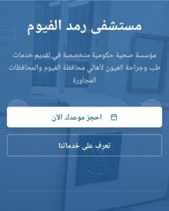 و تعد مستشفى رمد الفيوم أول مستشفى حكومي بالفيوم ينشئ موقعاً إلكترونياً يتم الحجز به وذلك تحت إشراف الدكتورة نيفين شعبان وكيل وزارة الصحة بالفيوم و الدكتورة حنان الجارحي مدير مستشفى الرمد بالفيوم