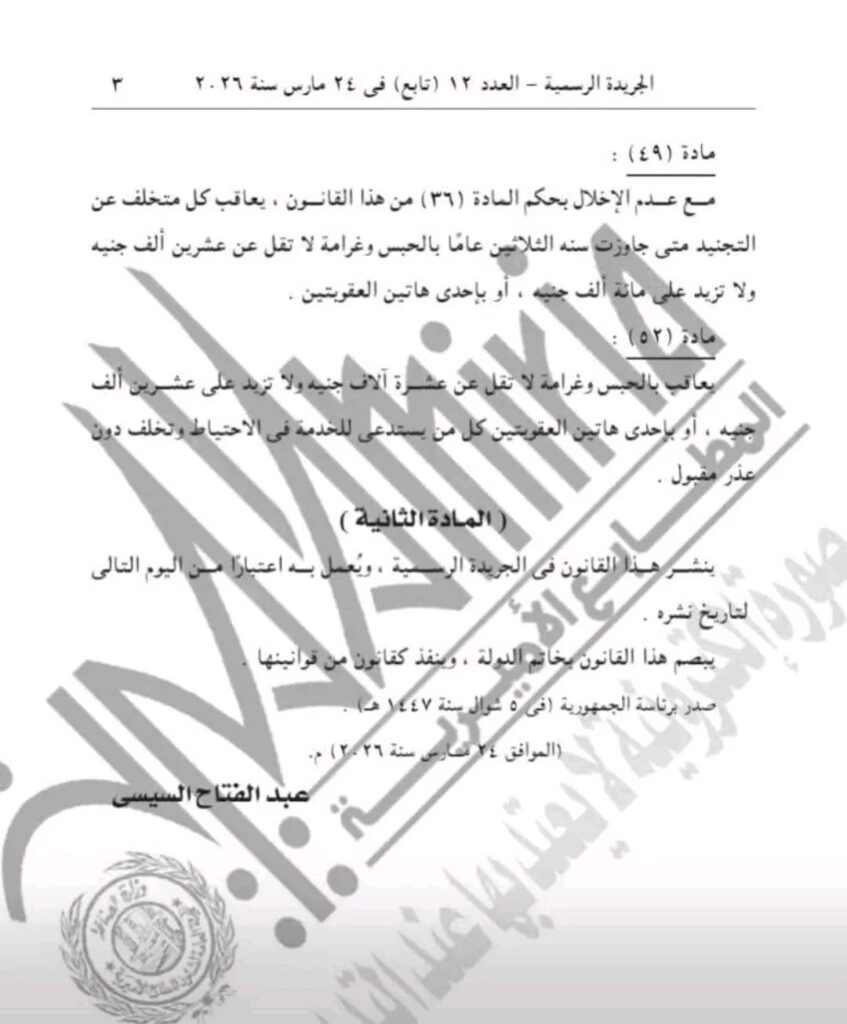 صدر اليوم في الجريدة الرسمية القانون رقم ٢ لسنة ٢٠٢٦ بتعديل بعض أحكام قانون الخدمة العسكرية والوطنية .