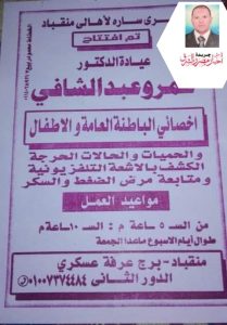 عياده الدكتور / عمرو عبدالشافى أخصائي الباطنه العامه والاطفال ببرج عرفه عسكرى بالدور الثانى وبمناسبة الافتتاح