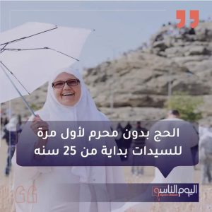وقال “حمزة عنبي” عضو الجمعية العمومية لغرفة شركات السياحة إن السيدات اللي يبلغ سنهم 25 سنة بحلول 1 مارس القادم، سيكون مسموح لهم ان يقدموا على قرعة الحج السياحي من غير محرم، والسيدات الأقل من 25 سنة لابد ان يكون معهم محرم في الحج، وهذا وفقًا للضوابط العامة المنظمة لحصة مصر من تأشيرات الحج.